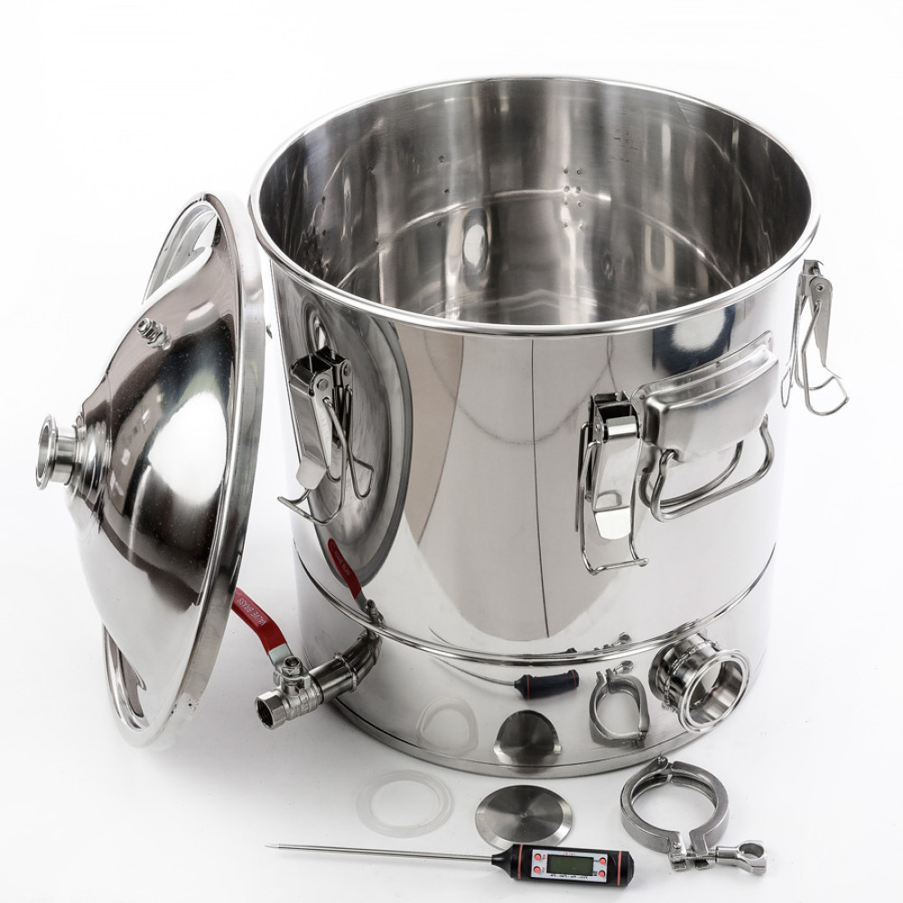 Distillation cube 30/350/t CLAMP (1.5 inches) under the heating element has an easy-to-use 350 mm cover and a flat induction bottom of the "sandwich" type, therefore it is suitable for use on stoves of all types and sizes, incl. induction. The presence of a 2-inch flange allows you to install heating elements with the appropriate size and different capacities to reduce the heating time of the primary wort and reduce energy costs. And the inner groove made around the circumference of the distillation cube will allow you to easily and simply install a false bottom with a diameter of 350 mm to prevent sticking of thick fragrant bregs. Thanks to this, home brewing will turn from a procedure for making homemade alcoholic beverages into a real art, the end result of which will be a high-quality, clean and incredibly tasty drink with which you can pamper yourself and all your friends.