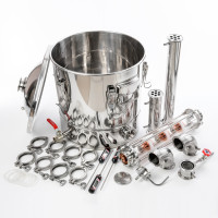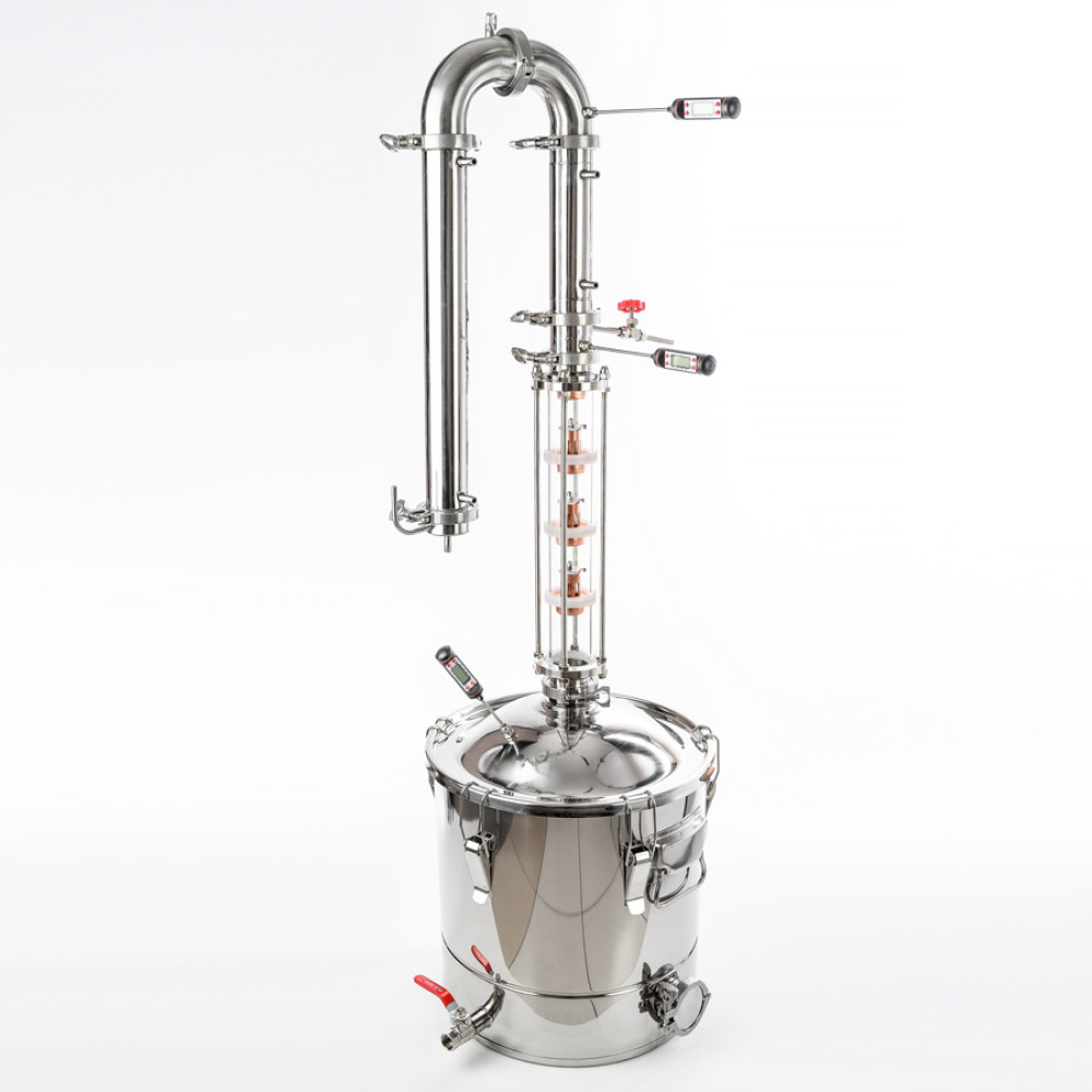 The set of equipment will be the best choice - the weight of the filled distillation still (volume 30 l) makes it easy to handle, the column design does not require high qualifications. Purification and production of the product is carried out in a semi-automatic mode, it is enough to set up the selection and the process will go by itself. On copper caps, there is a constant interaction of ascending vapors of alcohol and cooled reflux (impurities with a boiling point lower than that of alcohol), so almost pure alcohol with a strength of up to 95 degrees leaves the beer column. All fusel oils and other heavy fractions under their own weight flow back into the distillation cube, which, after the end of the distillation process, can be conveniently drained thanks to the ball drain valve.