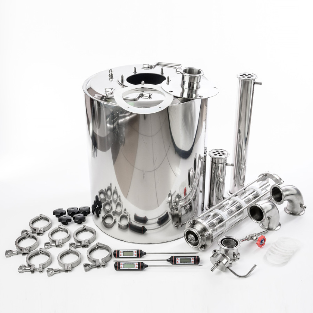The set of equipment is suitable for those who prefer to receive the maximum volume of the finished drink in one cycle of distillation. The volume of the cube 40 liters is close to the limit, which can be used in an ordinary kitchen. The productivity of the capping brace "Gorilych" 40/110/t is confirmed by reviews of real owners and amounts to 2 liters of pure distillate per hour. The diameter of the neck of 110 mm allows you to wash the distillation cube with minimal time costs.