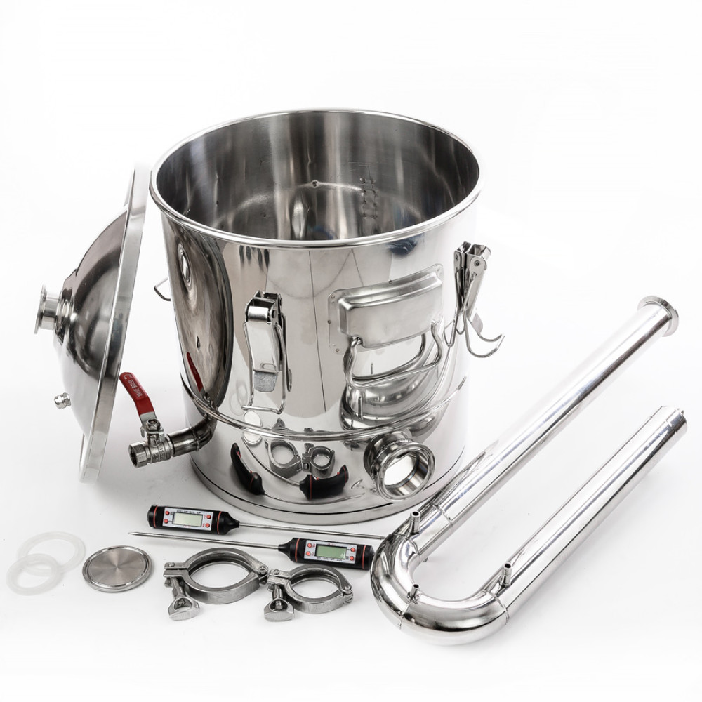 firstly, a 2-inch KLAMP-type fitting installed in the lower part of the distillation cube for a simple and convenient installation of heating elements with appropriate fastening. This opportunity will allow many to reduce the time to warm up the initial wort and reduce energy costs. The rest of the time, the fitting is securely closed with a plug and a clamp that come with the kit;