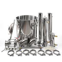 A powerful 3-inch shell-and-tube cooler with a length of 40 cm, inside of which there are 12 tubes with a bore diameter of 10 mm, makes it possible to utilize up to 10 kW of supplied heating power per distillation cube with relatively small volumes of water consumption (depending on the temperature of the supplied water). A diopter with a built-in liquid take-off unit allows the user to set the column to a “pre-flooded” state, which will increase the separating ability of the column, which will allow 96.6% alcohol to be removed at high speed. The combination of liquid take off and 2-in-1 diopter simplifies column assembly and reduces the number of fittings. The jacket-type aftercooler has a diameter of 25 mm and a length of 350 mm, which indicates its high performance. For operation in potstill and distillation modes, two 90-degree outlets have been added to this package, one of which has a fitting for a thermometer, a powerful 3-inch shell-and-tube reflux condenser 20 cm long, inside which there are 12 tubes with a through diameter of 10 mm.
